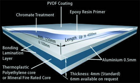 Aluminum composite panels Consists of two layers of smooth aluminum skins (0.2mm-0.5 mm thk) sandwiching a polyethylene core, thermo-bonded by polymer adhesive fi lm in a continuous thermo co-extrusion process, pre-fi nished with a premium coil coating, PVDF2 or Polyester coating and available in a variety of lengths and widths to allow for imaginative design and creativity.