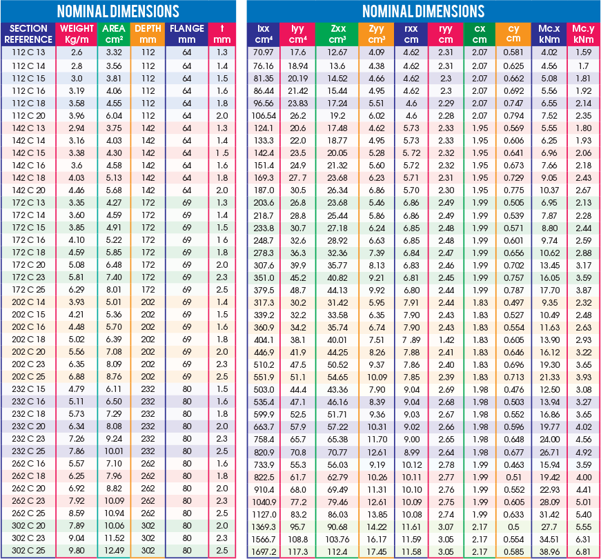 The section reference of a C-Section 302mm deep and 2.5mm thick = 302 C 25. The fi rst 3 digits of the section reference indicate the depth of the section in millimeters (ie: 302 equals 302mm deep) The fourth digit is letter that signifi es the profi le type (ie:C for C profi le). The last two digits indicate the material thickness (25 equals 2.5mm)