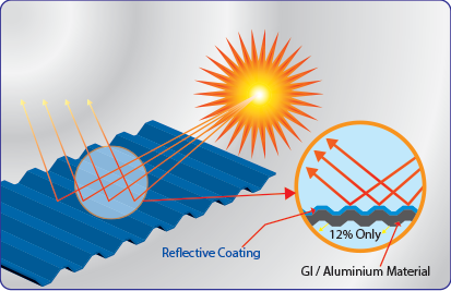 Highly reflective roofs can reduce the indoor temperature of buildings by 10 to 12 degrees Celsius, which lowers their cooling needs and thus results in cooling energy savings of approximately 10 to 20 percent on the fl oor under the roof. The thickness of the Insulation fill material (E.g. – Rockwool) can be reduced without compromising the thermal resistance of whole system.