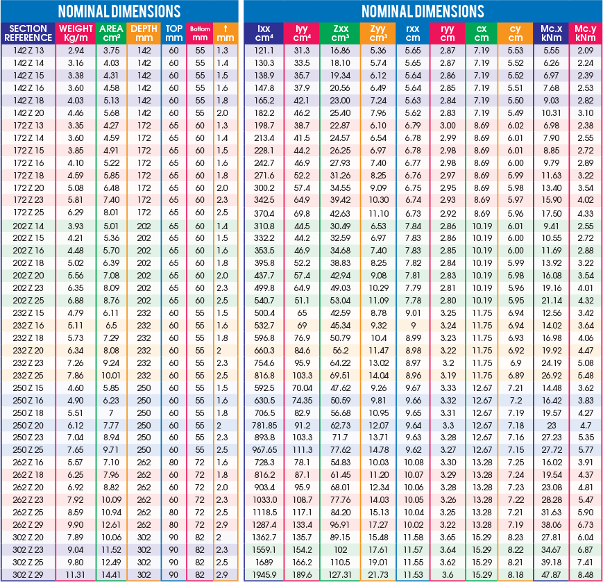 The section reference of a Z-Section 202mm deep and 2.5mm thick=202 Z25. The first three digits of section reference indicate the depth of the section in millimeters (ie: 202 equals 202mm deep). The fourth digit is a letter that signifies the profile type(ie: Z for Z profile). The last two digits indicate the material thickness 25 equals 2.5mm).