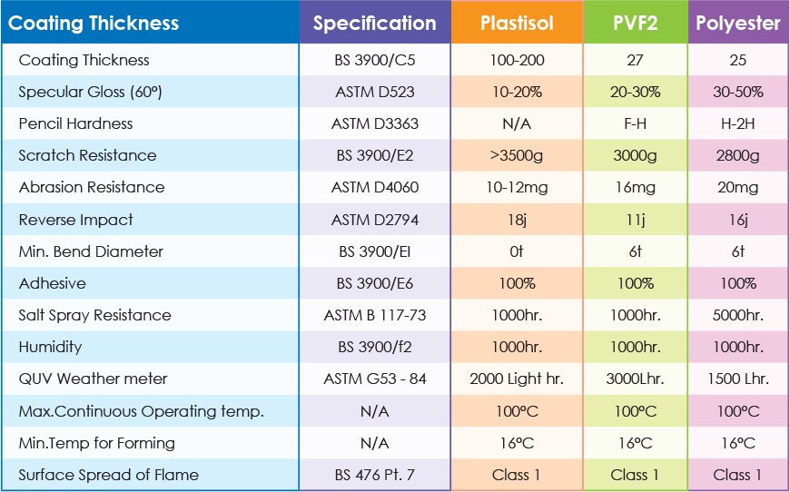 Plastisol is 100-200 microns (0.1mm-0.2mm) thick polyvinyl chloride coating (PVC) this coating exhibited an embossed leather grain fi nish. It is tough; withstand rough treatment in workshop, during transit, and on site. Plastisol is suitable for cold stores due to its excellent resistance to corrosion temperature and cleaning process.
